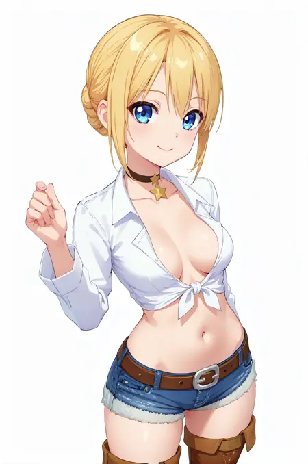 2 - cowboySet, thigh boots, tied shirt, denim shorts, choker, belt, navel