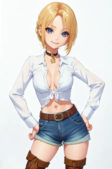 2 - cowboySet, thigh boots, tied shirt, denim shorts, choker, belt, navel
