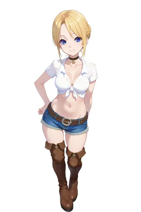 2 - cowboySet, thigh boots, tied shirt, denim shorts, choker, belt, navel