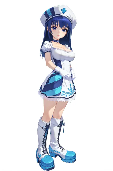 2 - mainSet, hat, short dress, white gloves, choker, puffy short sleeves, striped, clothing cutout, knee boots