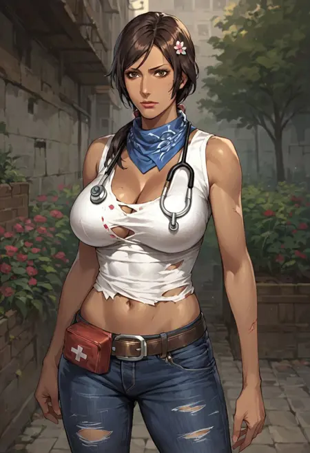 服装 - 破损的背心,露胸,露脐,破洞牛仔裤,沾有血迹,布料撕裂