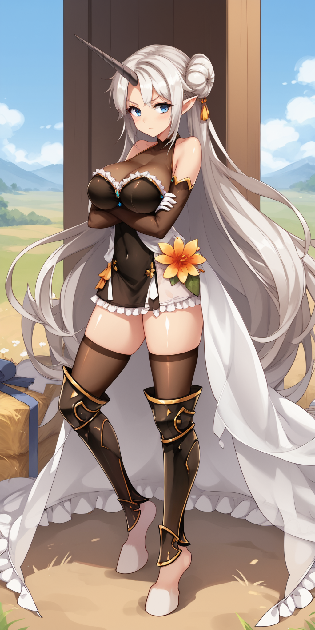 主要标签:white-hornunicorn,蓝眼睛,尖耳朵,长发,发髻,马蹄。