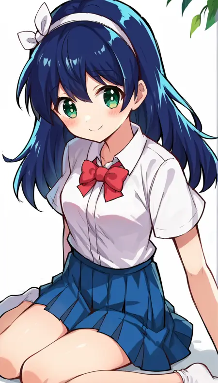 shiiho, dark blue hair, green eyes, white headband, white hair ribbon, breasts