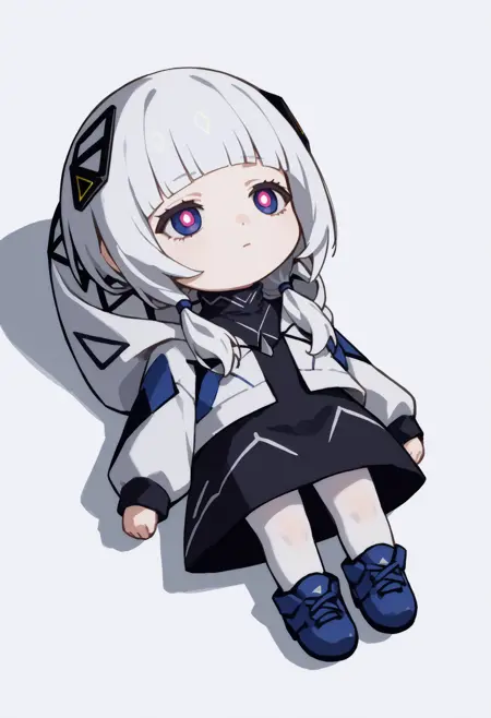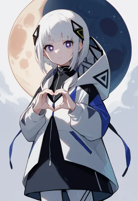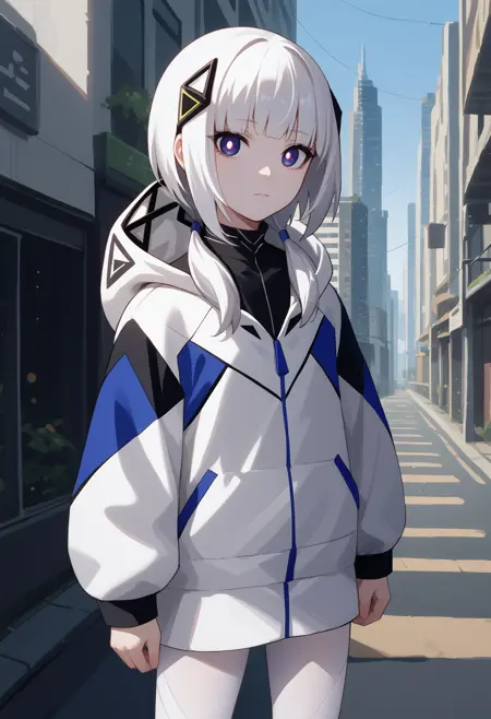 デフォルトの服装: 白いジャケット, フード付きジャケット, フードを下ろした状態, 長袖, 黒いシャツ, 黒いドレス, チュールネック, 白いパンティーストッキング