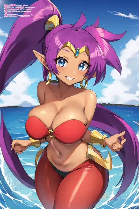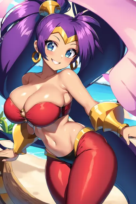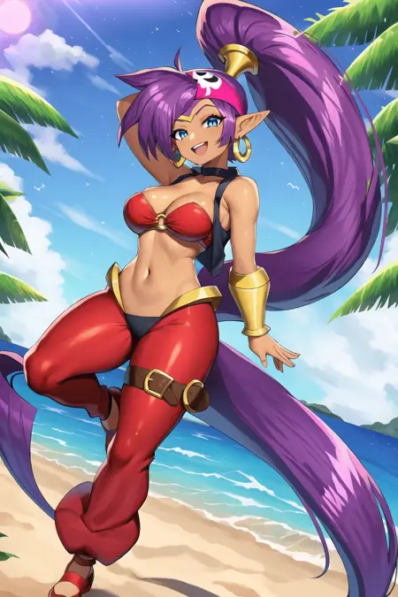 shantae \(pirate\), 1girl, solo, 날카로운 귀, 보라색 머리카락, 미소, 배꼽, 어두운 피부, 어두운 피부를 가진 여성, 파란 눈, 긴 머리카락, 보석, 입을 열고 있는 모습, 귀걸이, 해변, ;d, 야외, 하렘 반바지, 관객을 바라보는 모습, 반바지, 가슴선, O링, 큰 가슴, 목걸이, 베스트, O링 상의, 바란다, 배, 복부, 높은 빈티지 헤어스타일, 팔걸이 보호대, 어깨를 드러낸 모습, 관자놀이, 종아리 스트랩, 빨간 반바지, 신발, 열린 베스트, 베스트