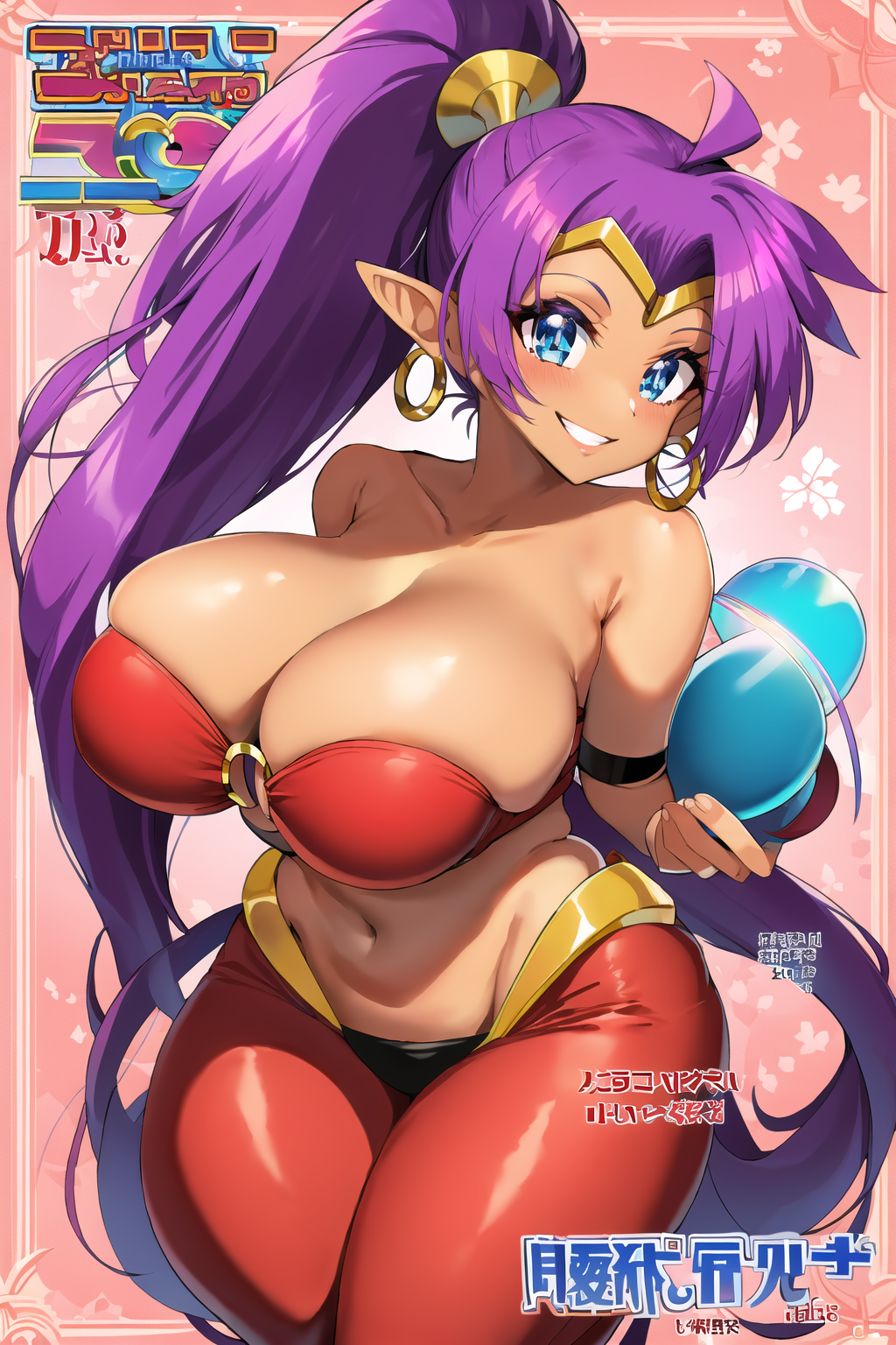 shantae \(og\), 넓은 골반, 거대한 가슴, 높은 빈티지 헤어스타일, 파란 눈, 사막, 밴도, O링, 빨간 하렘 반바지, 야외, 어두운 피부를 가진 여성, 미소
