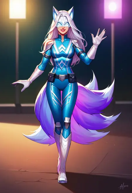 蓝色紧身衣造型: Fit1,发光的眼睛,白色狐狸面具,白色狐狸耳朵,多彩紧身衣,蓝色紧身衣,白色紧身衣,白色手套,黑色多功能腰带,黑色口袋,白色狐狸尾巴,多条尾巴,白色靴子,白色鞋履,利爪