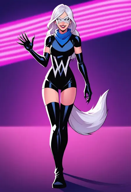 黑色紧身连衣裤造型: Fit2,白色多米诺面具,蓝色围巾,黑色紧身连衣裤,短袖,黑色肘部手套,黑色过膝袜,黑色高筒靴,白色狐狸尾巴,黑色鞋履,利爪,绝对领域