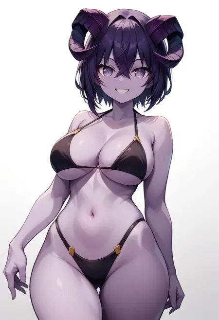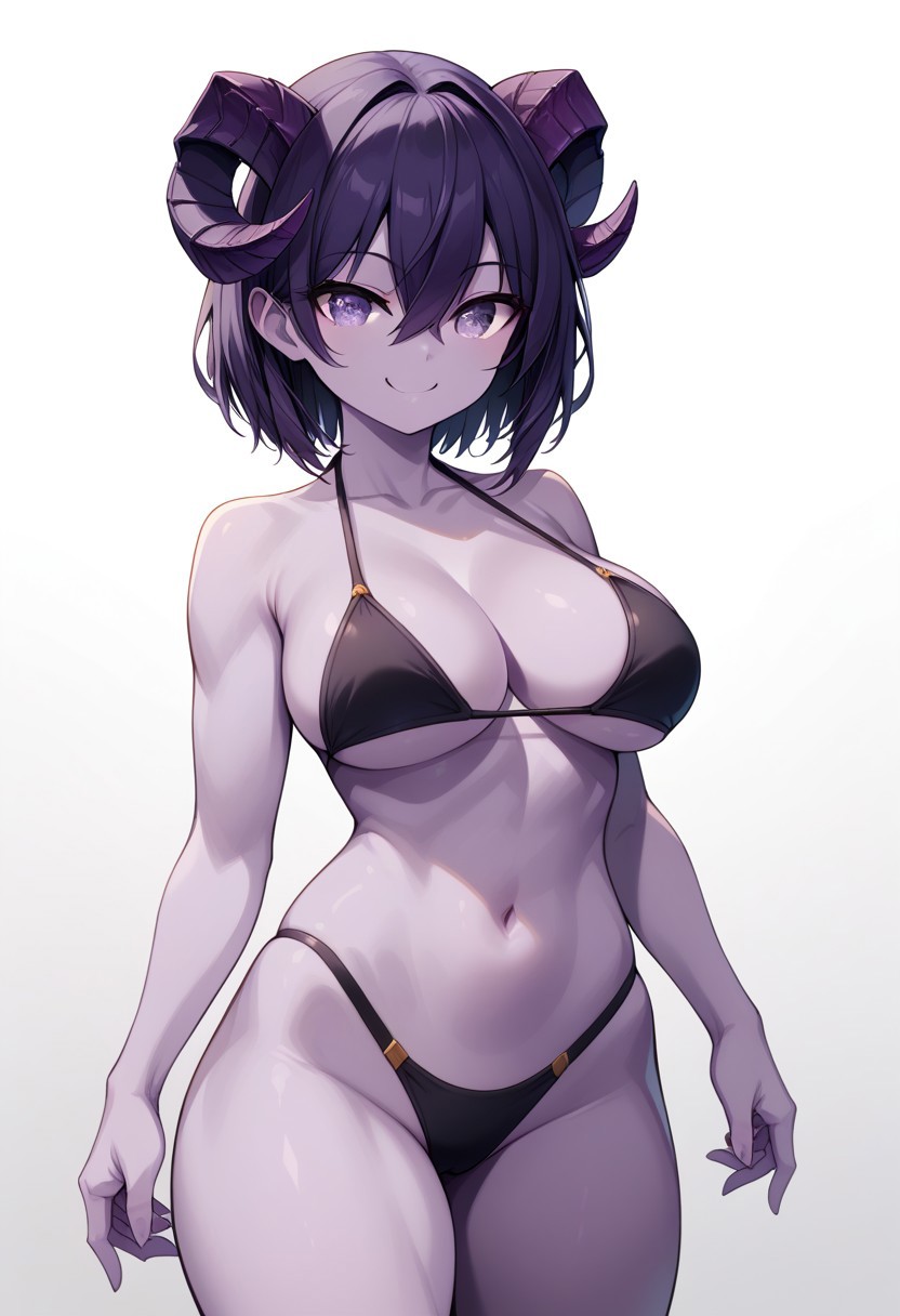 amethystvesper,colored skin,purple eyes,purple hair,short hair,horns,bikini,high heels