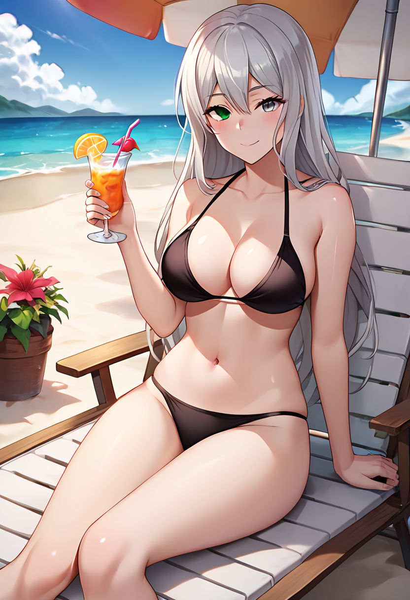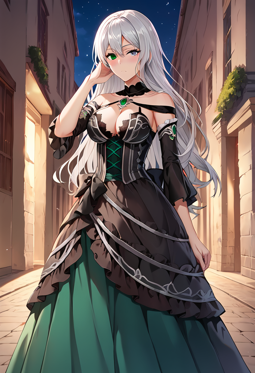 トリガー語: alfia_danmachi, 異色瞳, 緑の目, 灰色の目, 長い髪, 銀髪, 公式アート,