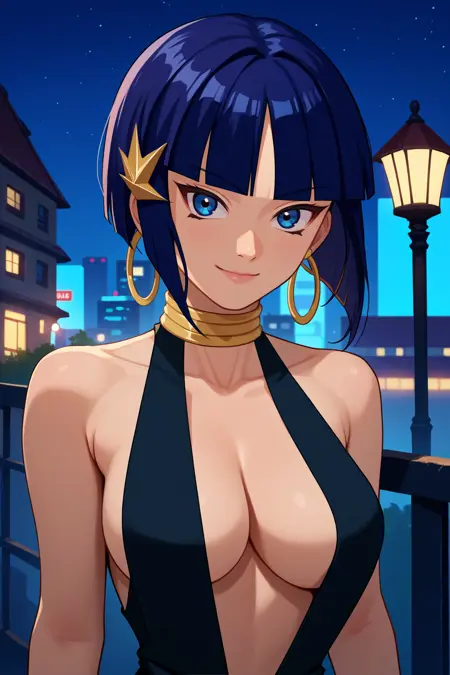 그녀의 전형적인 외모를 위해서는 "머리 장신구, 고리 귀걸이, 금색 목걸이, 검은 드레스, 소매 없음, 깊은 네크라인, 긴 드레스"를 추가하세요.