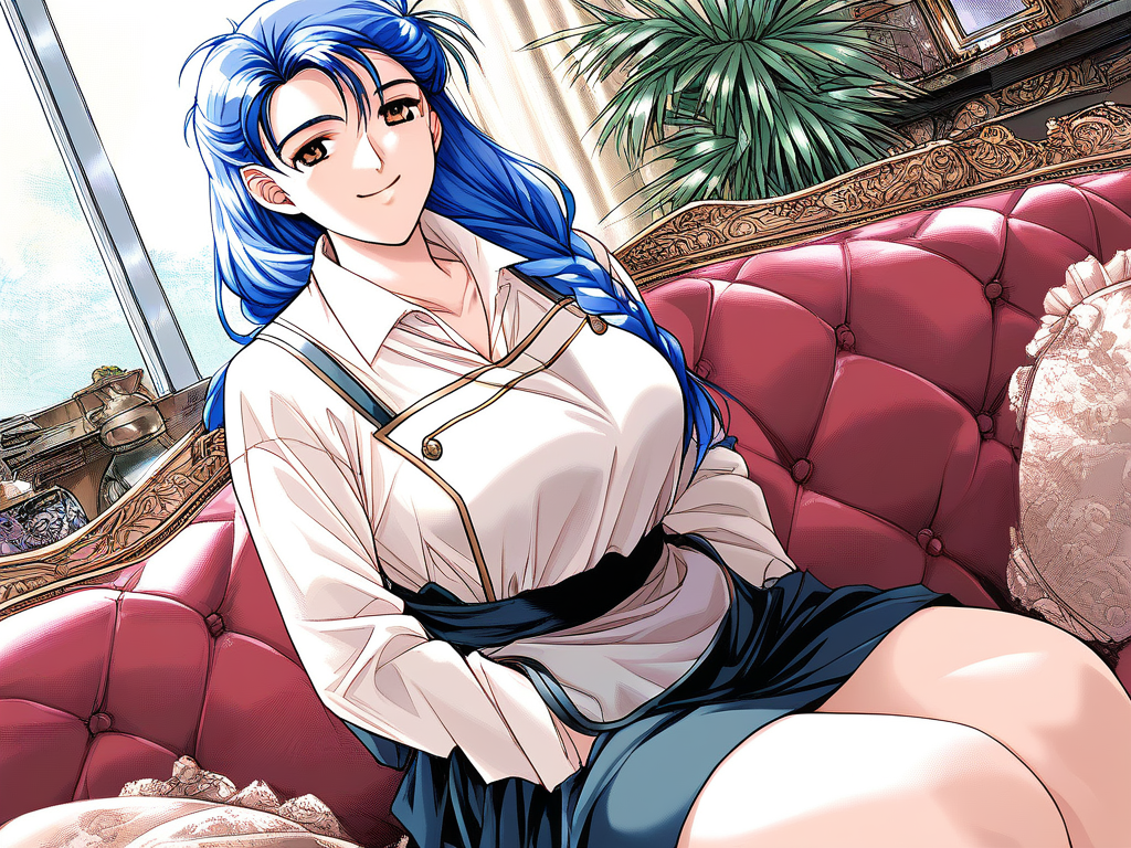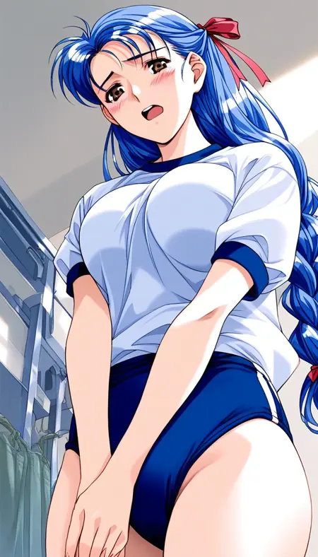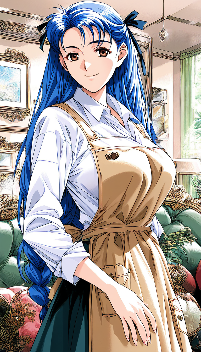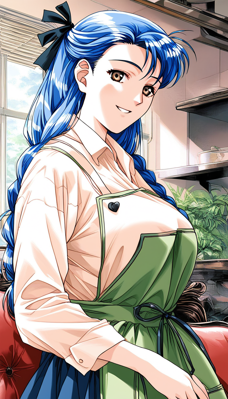 Narusawa_Misako(Doukyuusei2), 1girl, solo, 파란 머리, 긴 머리, 갈색 눈, 큰 가슴, 땋은 머리, 머리리본, 검은 리본