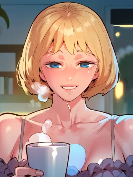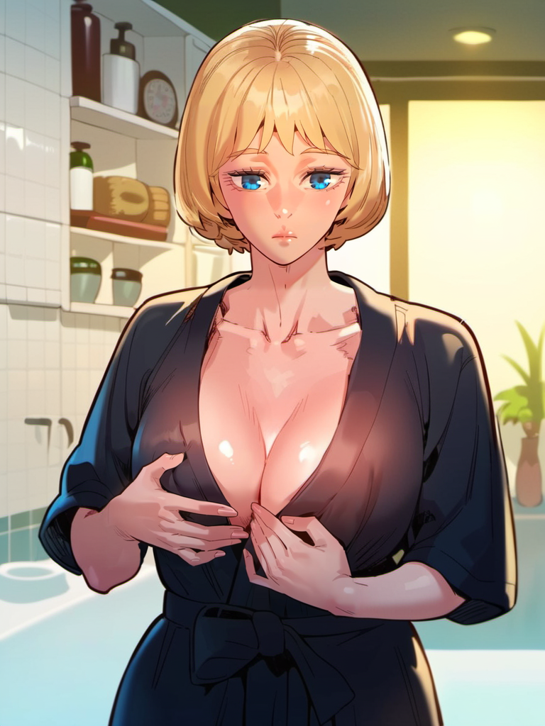 Bora、1girl、ショートヘア、ブロンドヘア、青い目、バスローブ、ローブ、鎖骨、胸元、