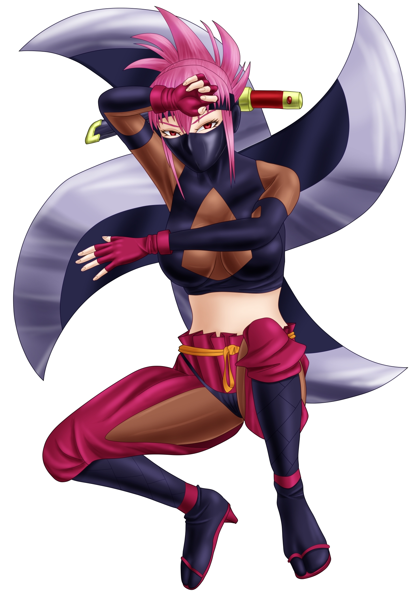 1girl, solo, miyabi, pink hair, folded ponytail, black eyes, upper bodystocking, ninja mask, mouth mask, black crop top, red dogi pants, reval black stockings, G-string out side pants, long elbow gloves, black boots