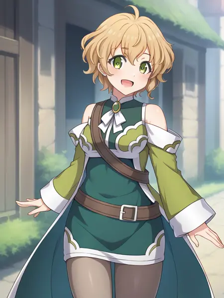 1girl, 1girl, solo, blonde hair, short hair, pantyhose, green sleeves, bare shoulders, dress, black boots, oramets, brow belt, green tunic, skirt, green eyes, long sleeves, ornaments
