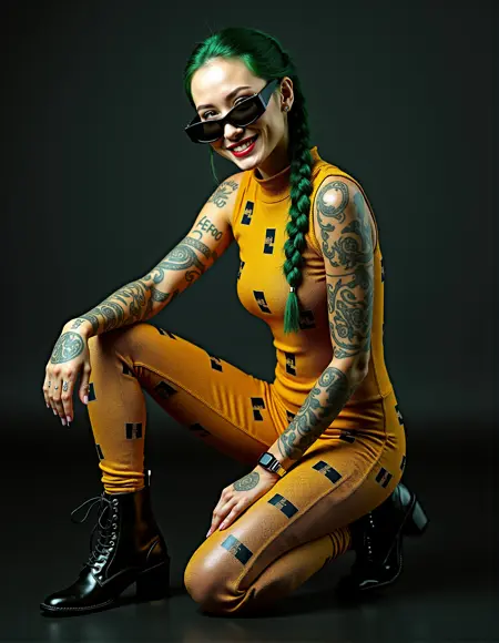 "outfit" 프롬프트에는: 점프수트, 선글라스, 허벅지까지 오는 부츠, 가방, 유명한 국제 브랜드가 포함됩니다.