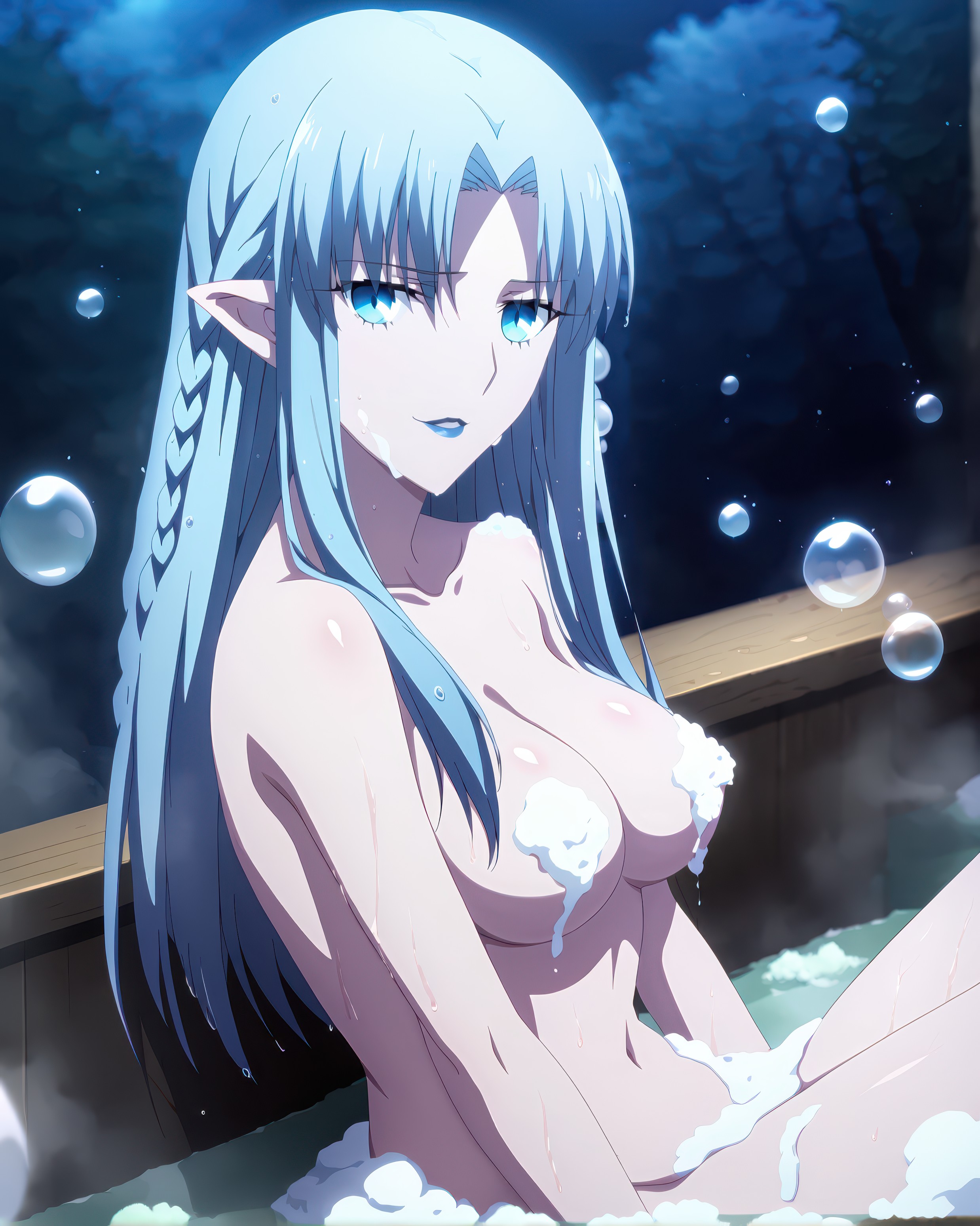 <lora:caster-09:0.8>, caster, 1girl, solo, 长发, 蓝眼睛, 蓝发, 辫子, 尖耳朵, 侧边辫, Medea (Fate), 蓝色唇膏, 下唇膏,