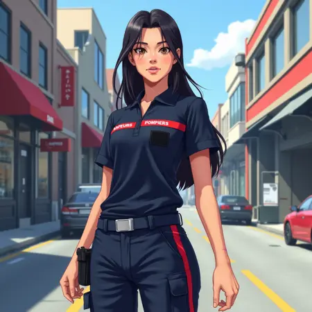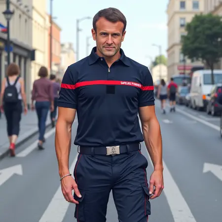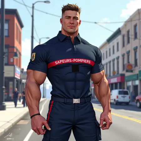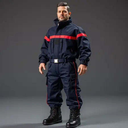 モデルは、胸の小さな赤いストライプや胸のパッチ(詳細はサンプル参照)を明確に指定するとより良く動作します。赤いストライプ内にテキストを追加できるデザインになっており、以下の形式で記述できます:「胸の赤いストライプ上に『SAPEURS-POMPIERS』(またはその他)というテキストを記載する』。