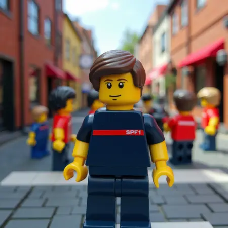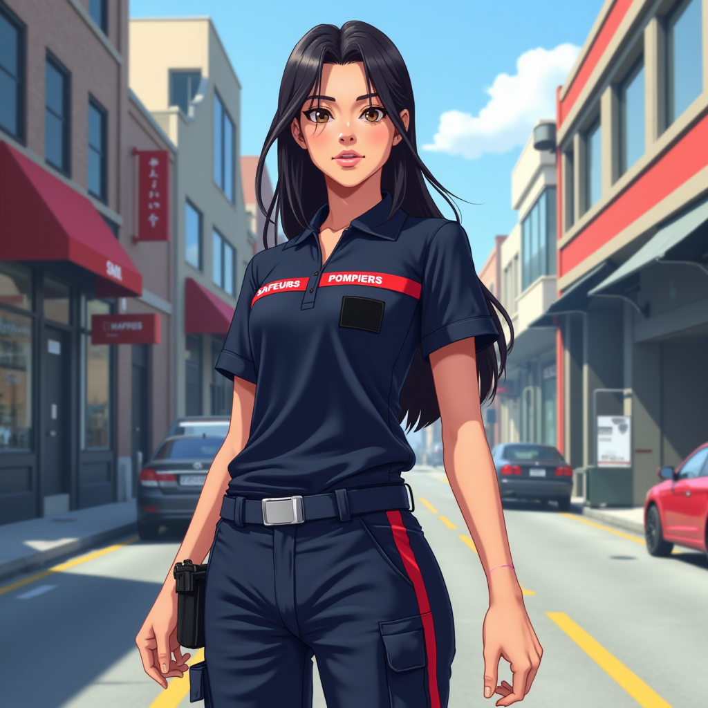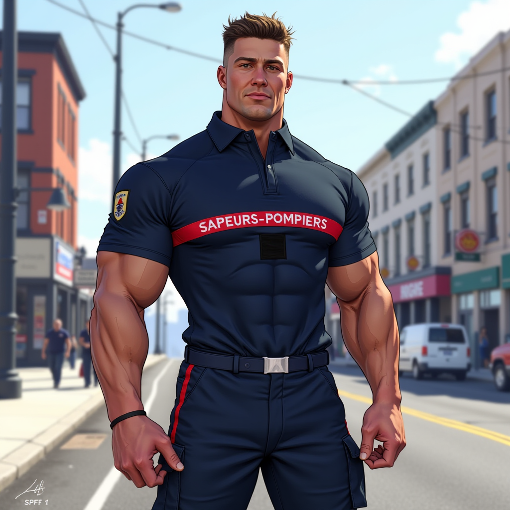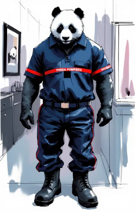 当明确说明细节,如胸前的小红条纹和胸章时,模型表现更佳(详见示例)。设计允许在红色条纹内添加文本,格式如下:“SAPEURS-POMPIERS”(或其他文字)写在胸前的细红条纹上。
