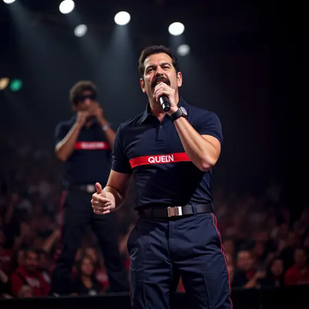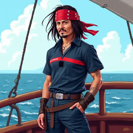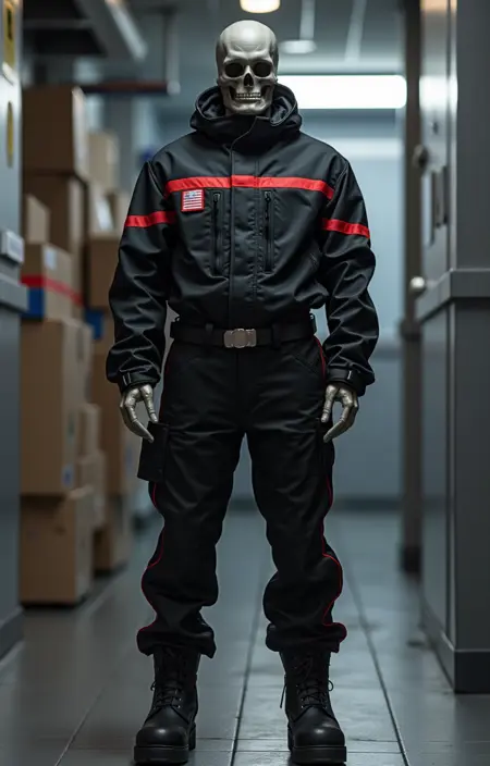 [角色] [场景] ... 穿着深蓝色SPF1 Polo衫、SPF1腰带和SPF1靴子。胸前中央有一个小的黑色方形胸章,文字“YOUR TEXT”写在胸前红色细条纹的右侧,左侧 [关于光线、环境等的详细描述...]