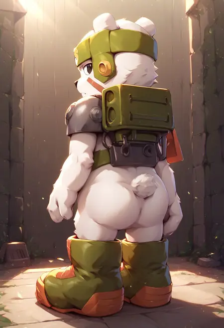 chackmon (character), digimon (creature), bear boy, black eyes, rocket launcher, headgear, boots, armor,