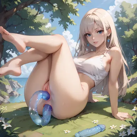 score_9,score_8_up,score_7_up,1girl,solo,best quality,highres,masterpiece,completely nude,nsfw,uncensored,outdoors,on grass,sex toy insertion,dildo insertion,object insertion,double penetration,vaginal object insertion,anal object insertion,sex toy,white tank top,