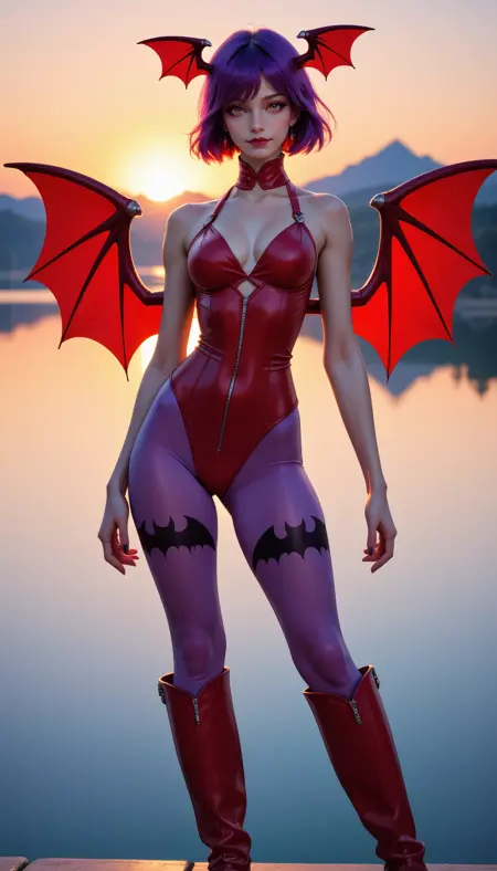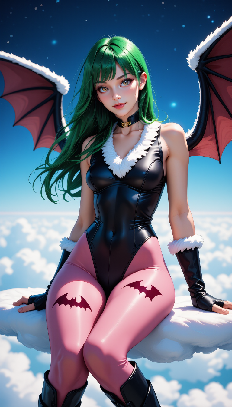 例:フルボディショット、モリガン・アーンスランド、長い緑色の髪、前髪、浮遊する髪、白い毛皮のトリム付き黒い革製レオタード、ノースリーブ、白く柔らかい雲の上に優雅に座る、(足を閉じた状態)、コウモリの翼、コウモリ柄のピンクのタイツ、黒いブーツ、星空、詳細描写、誘惑的、無垢、(被写界深度)、(繊細なテクスチャ)