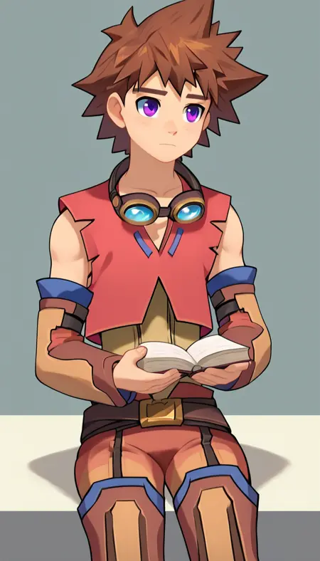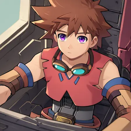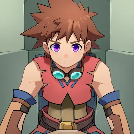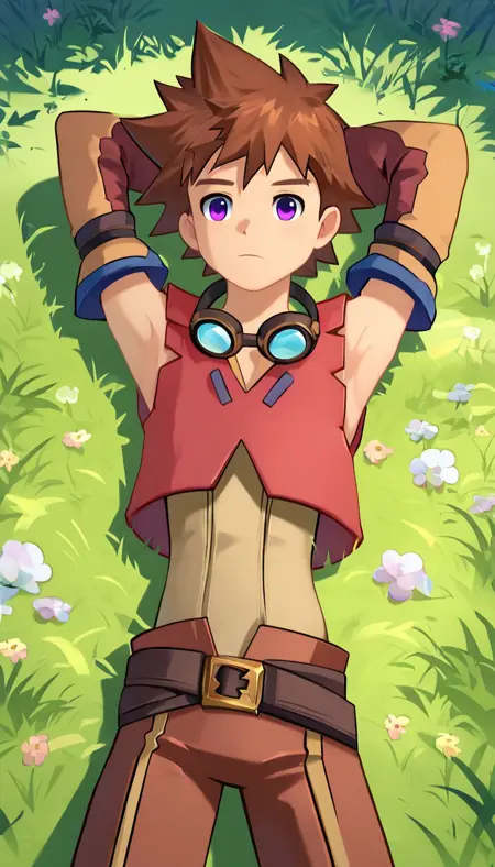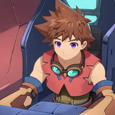 ruuji familon,purple eyes,goggles around neck,crop top,shirt,detached sleeves,belt,pants,boots