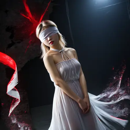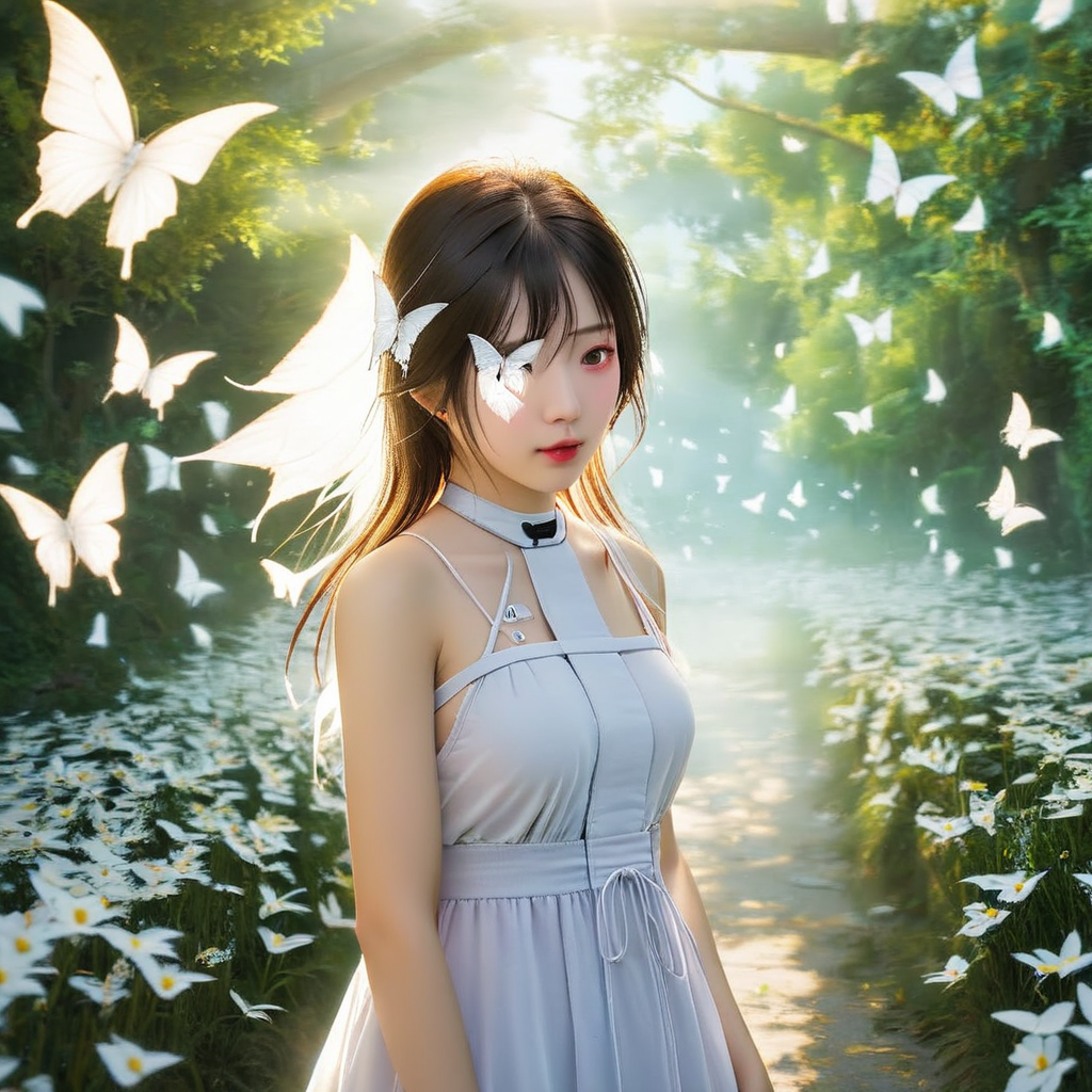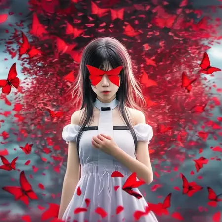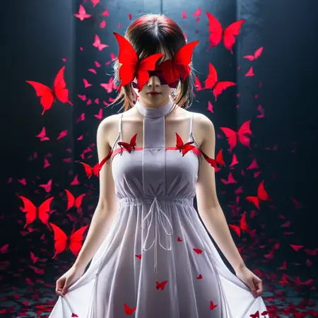 Suggested words: 1girl, white dress, blindfold, butterflies