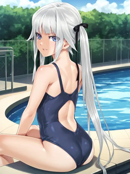 blue eyes, twintails, hair ribbon, black ribbon, school swimsuit, blue one-piece swimsuitSchool uniform: