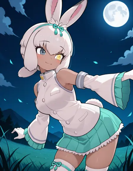 【外貌】 tsukuyomi shinshi \(kemono friends\),深色皮肤,深肤色女性,兔娘,兔耳,额外耳朵,兔尾,尾巴,多彩发色,白发,灰发,发带,蝴蝶结发带,鬓发,发丝遮眼,异色瞳,蓝眼,黄眼,