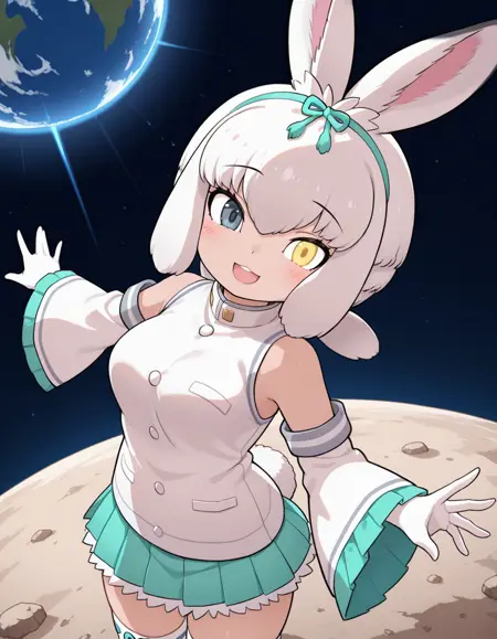 [外貌] tsukuyomi shinshi \(kemono friends\),兔娘,动物耳朵,兔耳,兔尾,尾巴,额外耳朵,白发,中长发,异色瞳,蓝眼,黄眼,中长发,刘海,发带蝴蝶结,发带,绿色发带