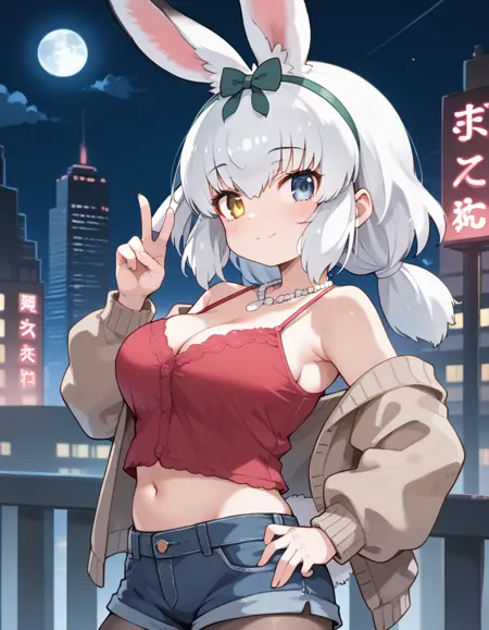 [Appearance] tsukuyomi shinshi \(kemono friends\), rabbit girl, animal ears, rabbit ears, rabbit tail, tail, extra ears, white hair, medium hair, heterochromia, blue eyes, yellow eyes, medium hair, bangs, hair bow, hairband, green hairband