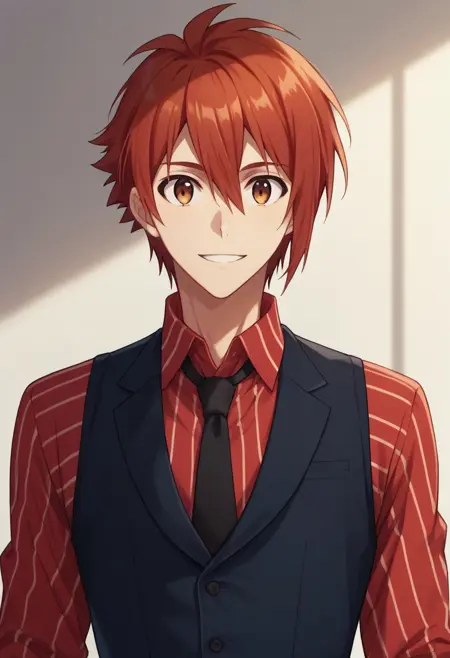 rikunanase, 1boy, male focus, necktie, solo, shirt, black necktie, collared shirt, striped, red shirt, hair between eyes, vest, red hair, red eyes, striped shirt,