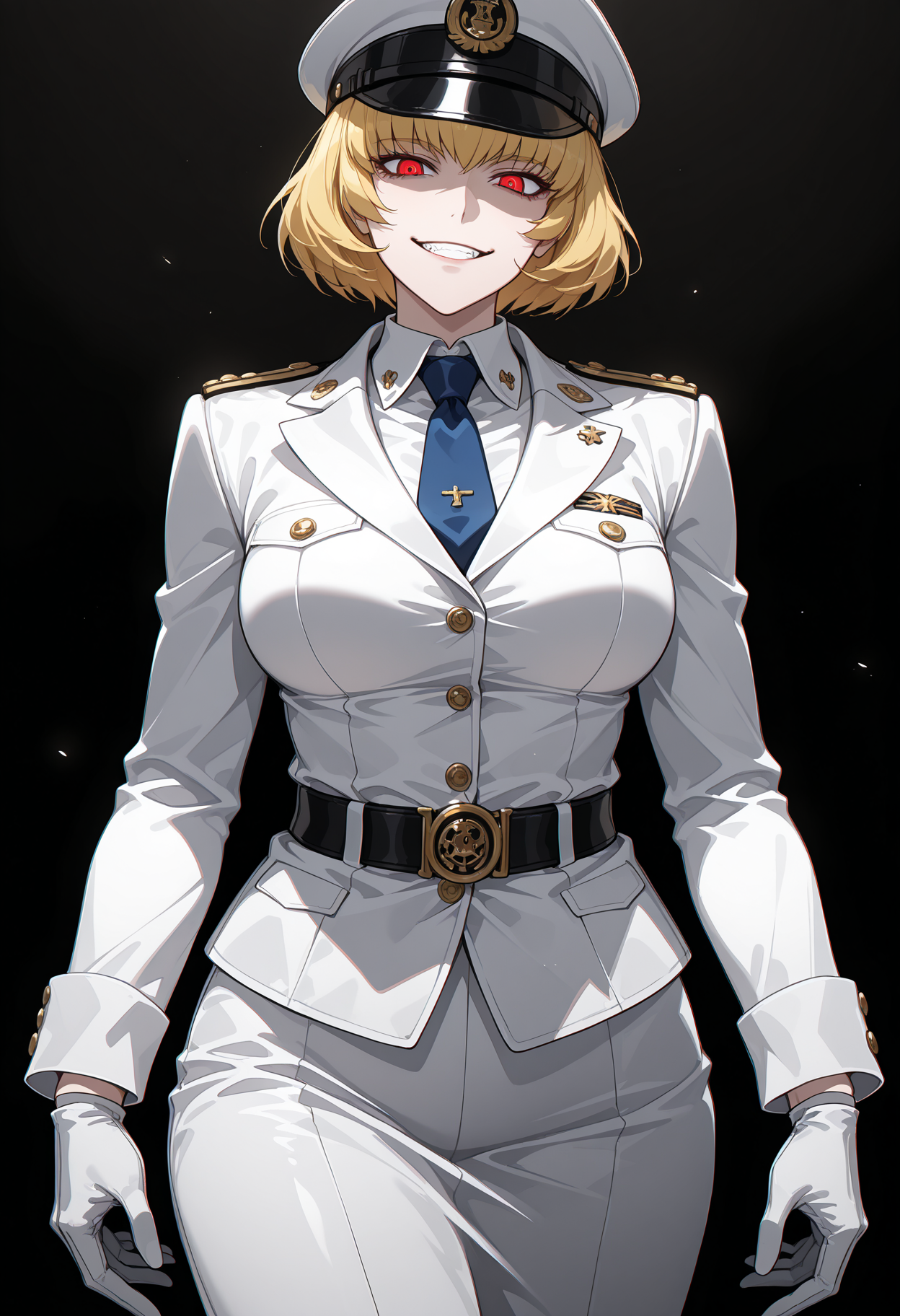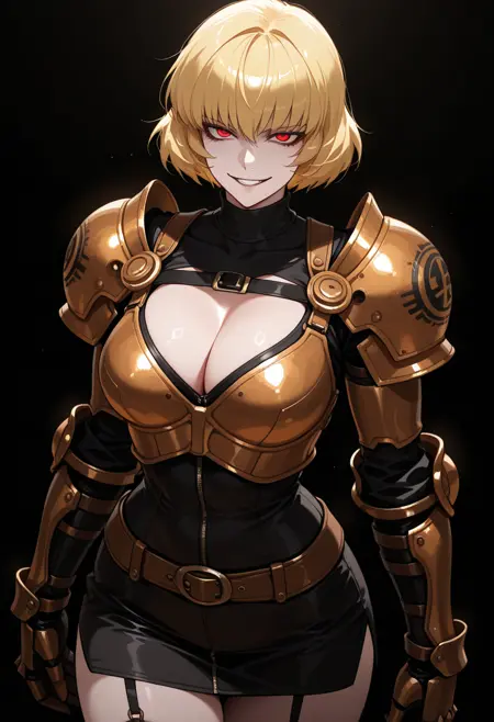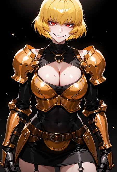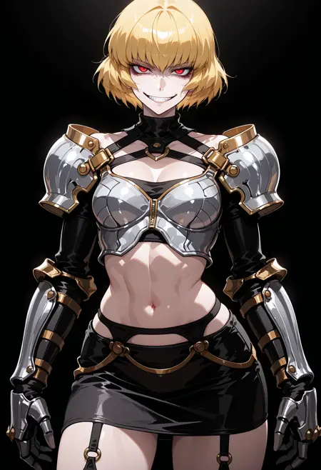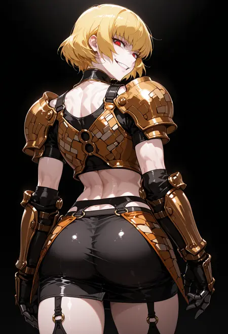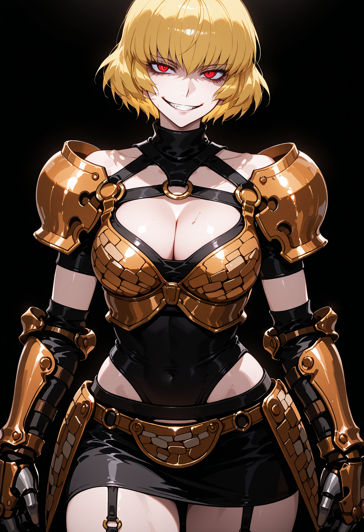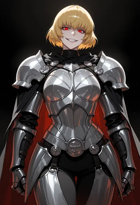 클레멘틴, 금발, 단발, 붉은 눈, 경장갑, 어깨갑옷, 장갑, 스트랩, 허벅지 양말, 한쪽 정강이 보호대, 스틸레토.