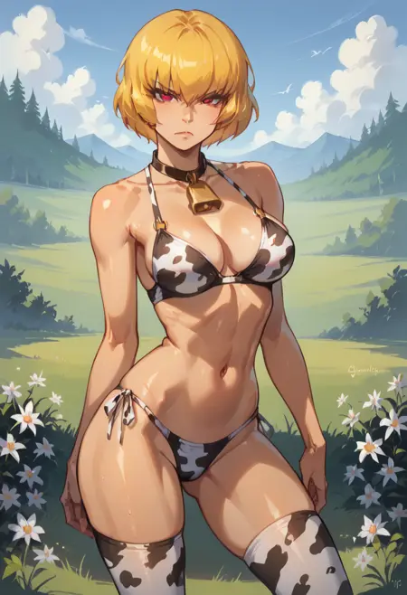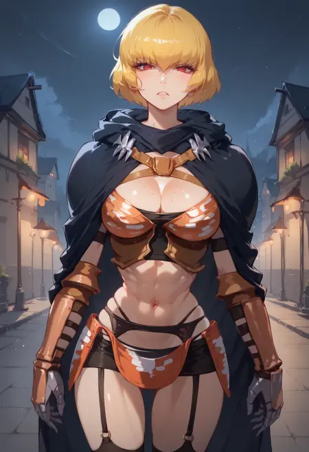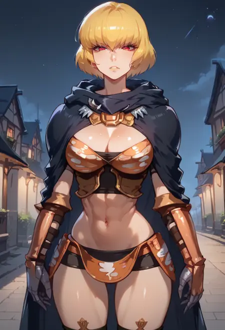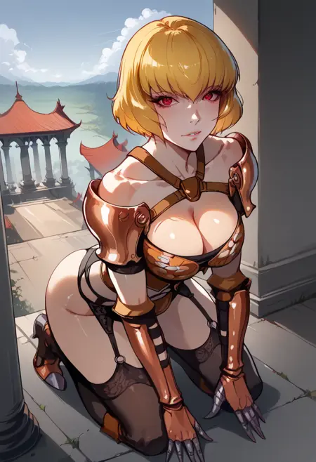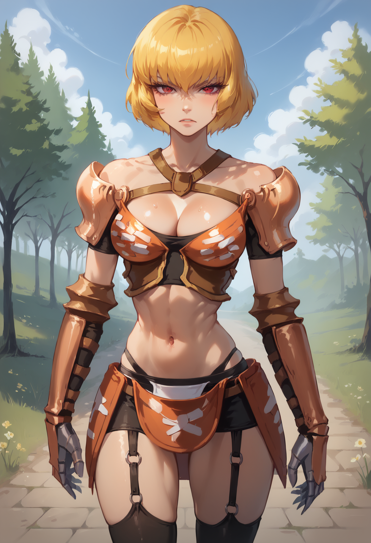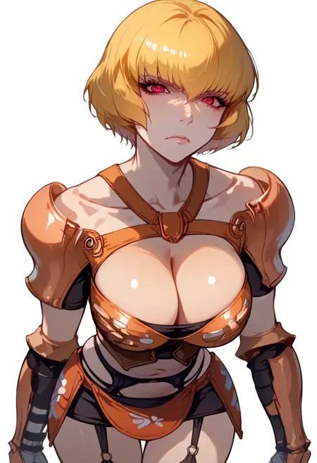 Clementine, blonde hair, short hair, red eyes, light armor, shoulder armor, gauntlets, garter straps, thigh highs, single greave, stiletto.