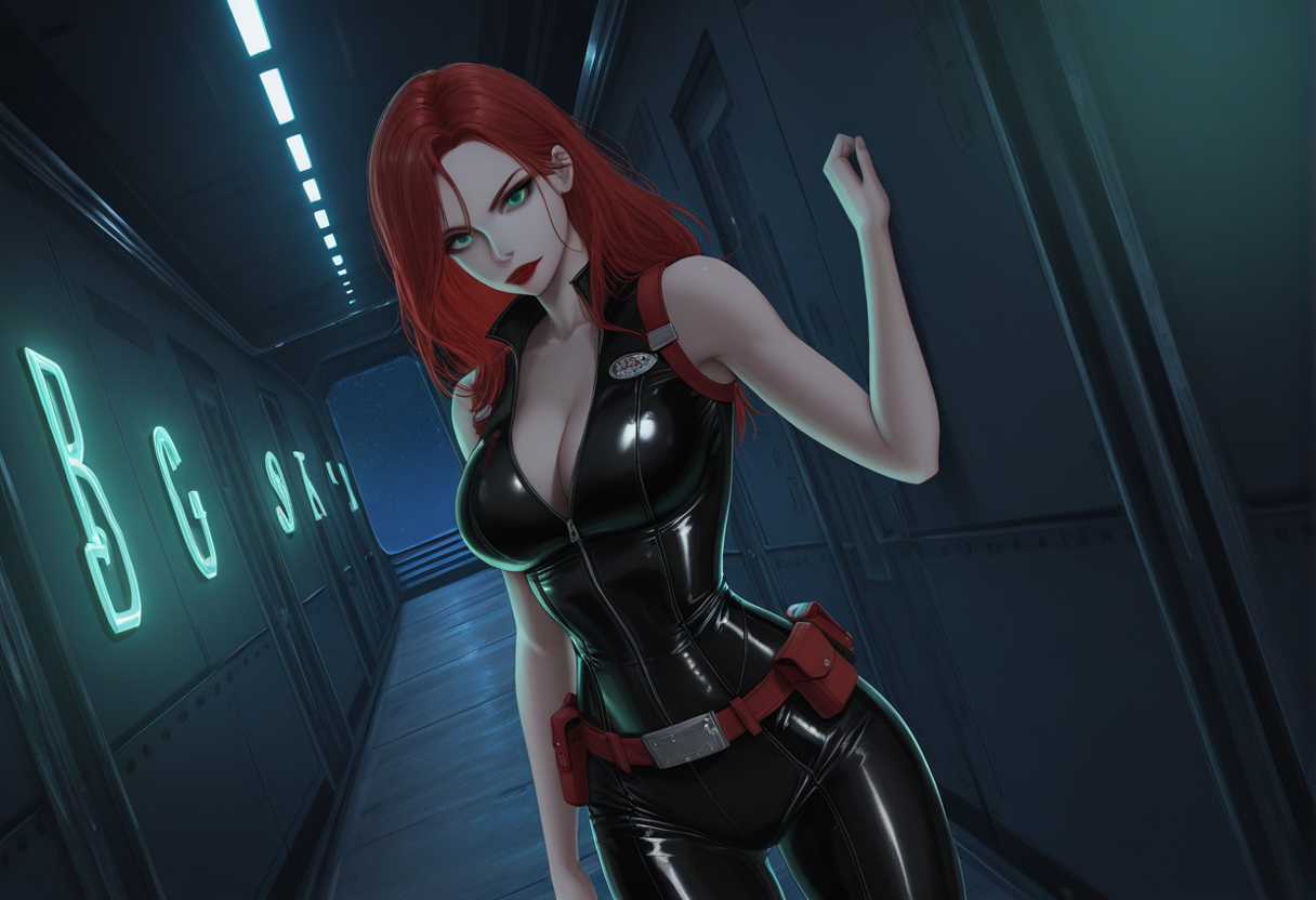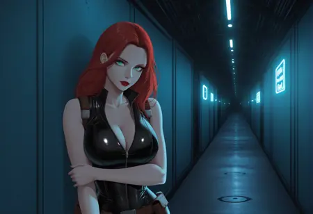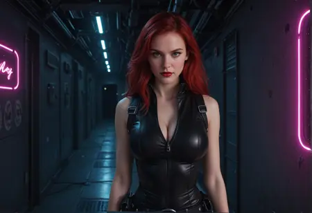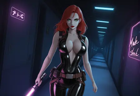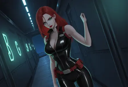 MaraJ, Red hair, green eyes, red lipstick, make up, eye liner, fit, thin, athletic, sleeveless leather cat suit, cleavage, utility belt,