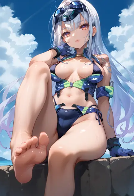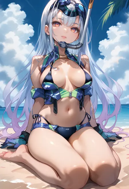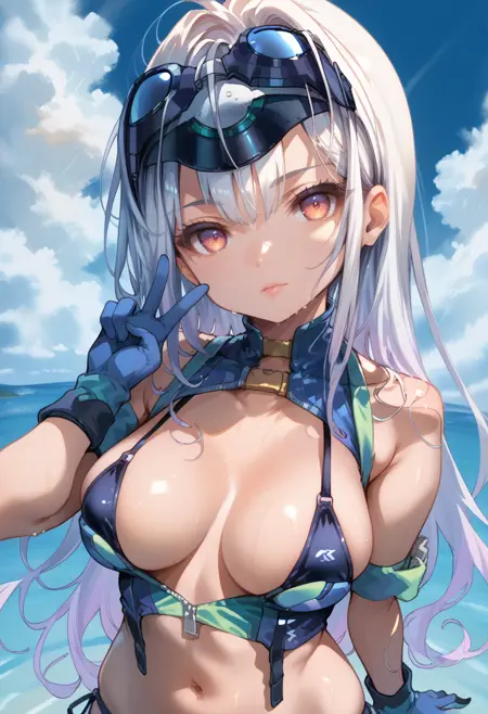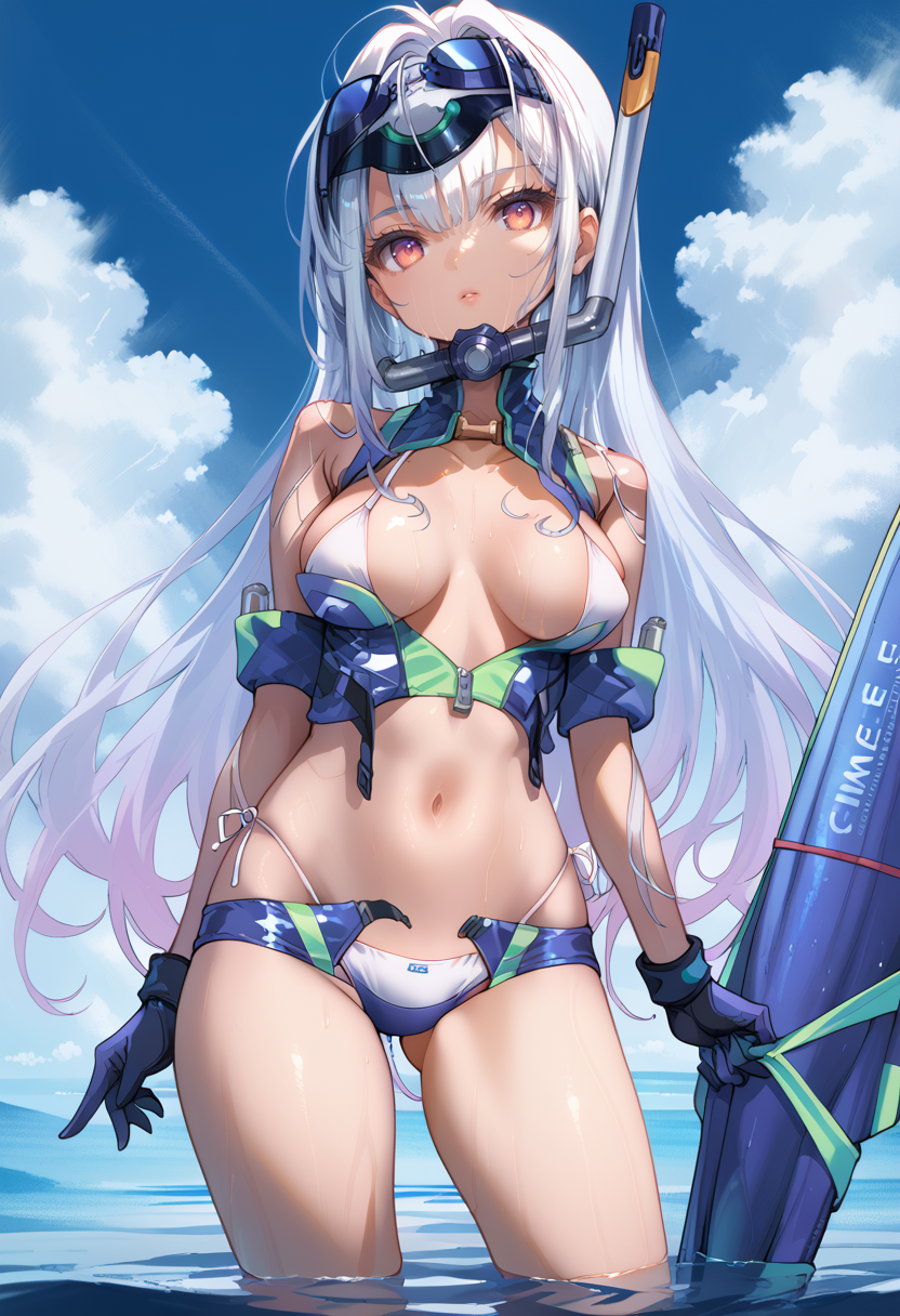 Tags (clothes): kos-mos ver4 model wx, black forehead protector, blue diving suit, blue gloves, snorkel, white bikini <-or-> Black bikini
