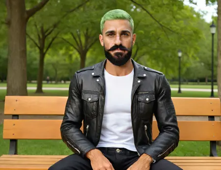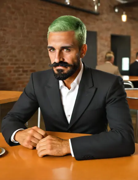 short blonde hair, thick brows, green brown eyes, black mustache, black short beard, spanish, latino