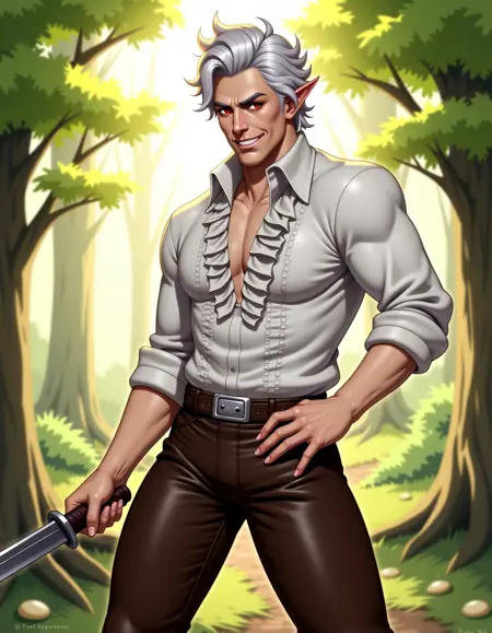 彼の普段のキャンプ着が欲しい場合は: 白いフリルシャツ、レザーのパンツ