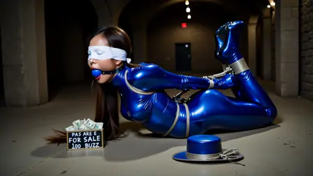 woman ,blindfolded, rope, naked, long hair,ball gag, in the back of a car, nipples, ring gag, a sign on front of the woman says "FOR SALE 100 BUZZ" on the floor there is a hat that is filled to to brim with money,