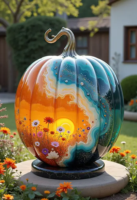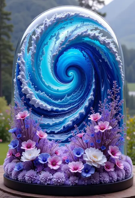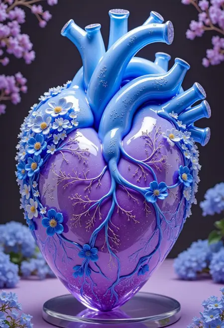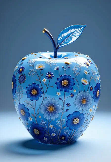 示例:一个美丽的苹果雕像,蓝色,花朵,8k,逼真。