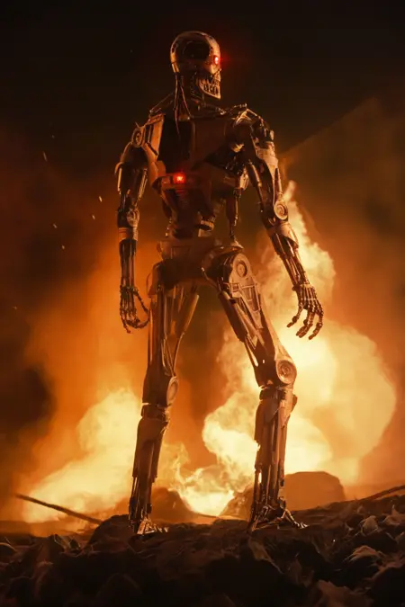an UpgradedT800_Endo Terminator Robot glowing red eyes