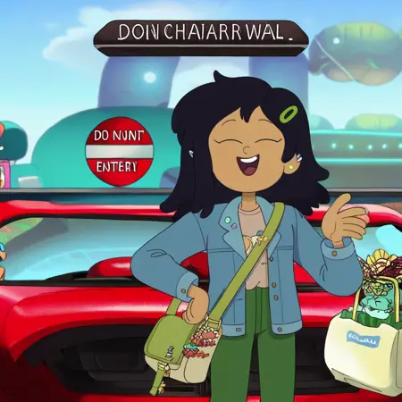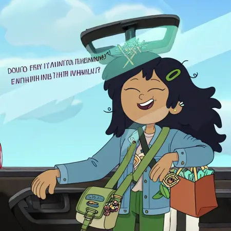 Long black hair, light blue jackect, green pants, bag, green hairclip, dark-skinned, ear piercing