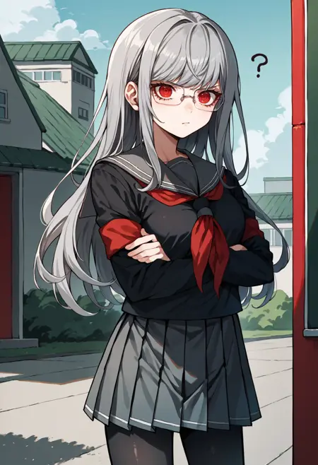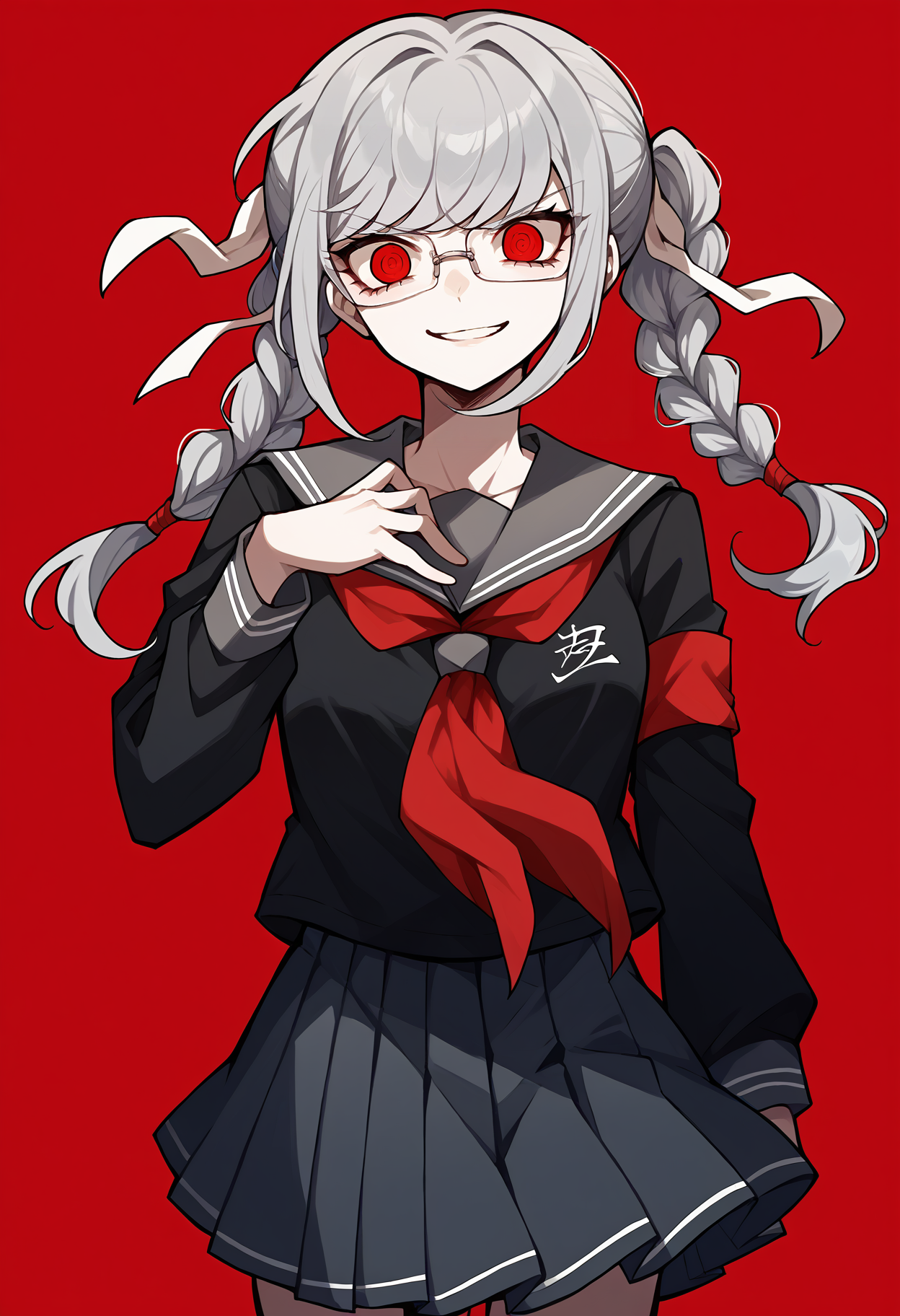 Default appearance: defPeko, grey hair, twin braids, red eyes, glasses, hair ribbon, white ribbon, school uniform, black serafuku, red neckerchief, long sleeves, red armband, pleated skirt, black pantyhose