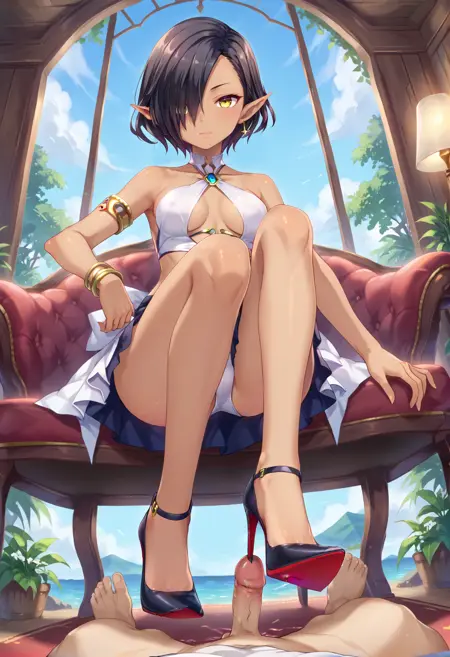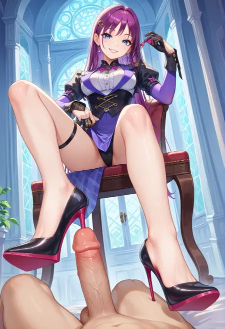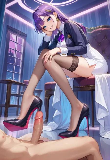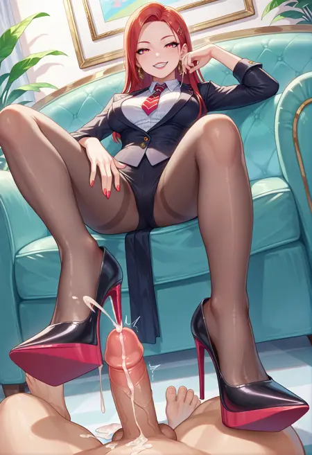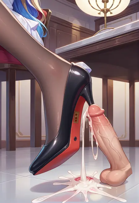 heelinsertion, high heels, shoes, penis, {ejaculation, cum, |} urethral insertion, 1boy, 1girl, sitting, looking at viewer {|, from side}