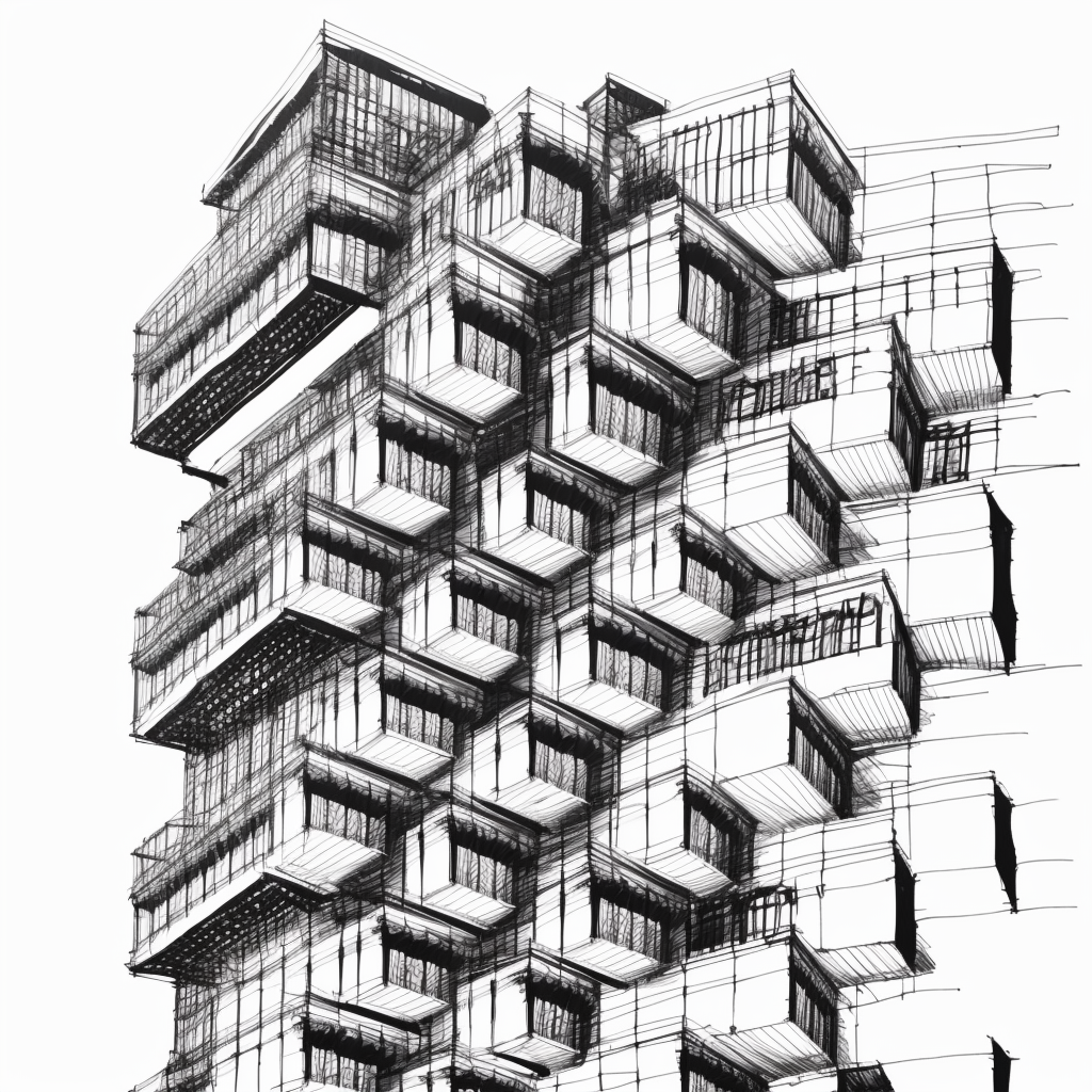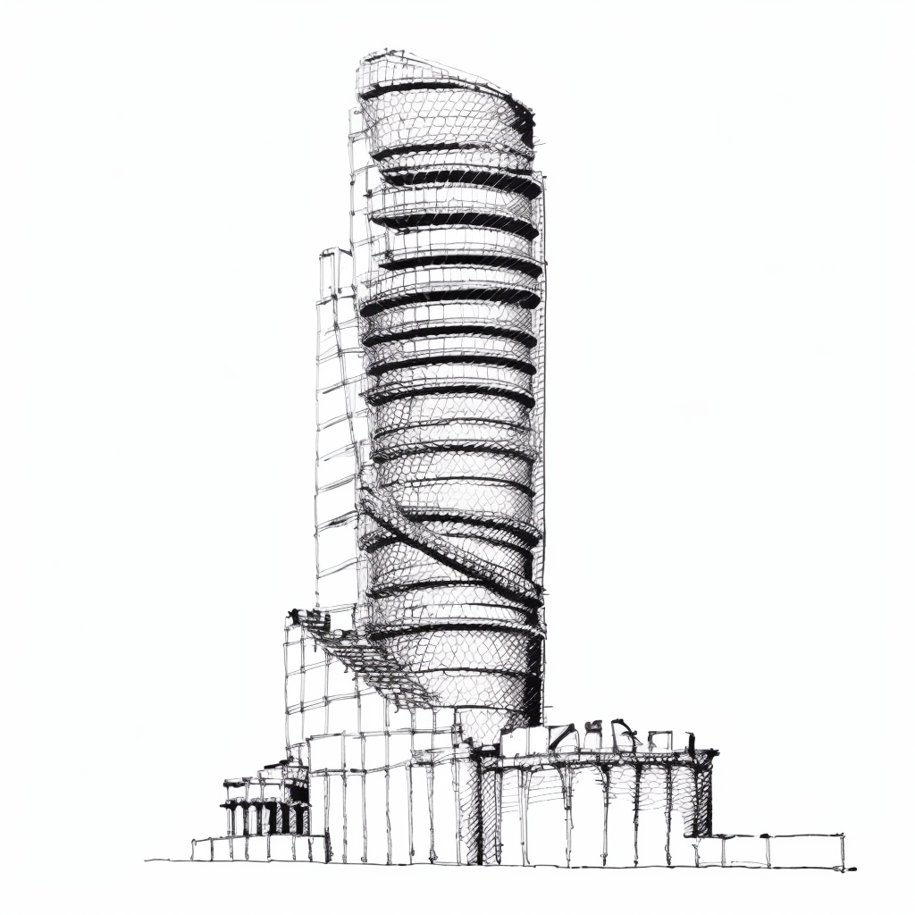 sketch of tower, black and white, ink drawing, crosshatching, white background, Azab style.负面提示: