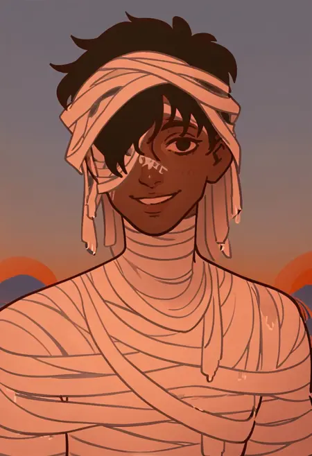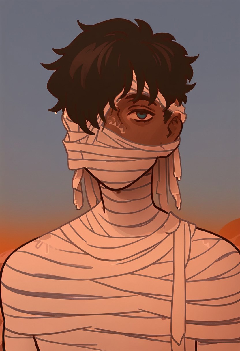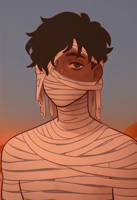 Mummy, dark skin, covered in bandages, bandages over one eye, black hair
