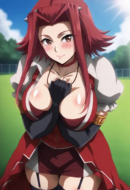 izayoi_school, red hair, brown eyes, short hair with long locks, necklace, choker, school uniform, white shirt, red jacket, miniskirt, pleated skirt, black thighhighs,