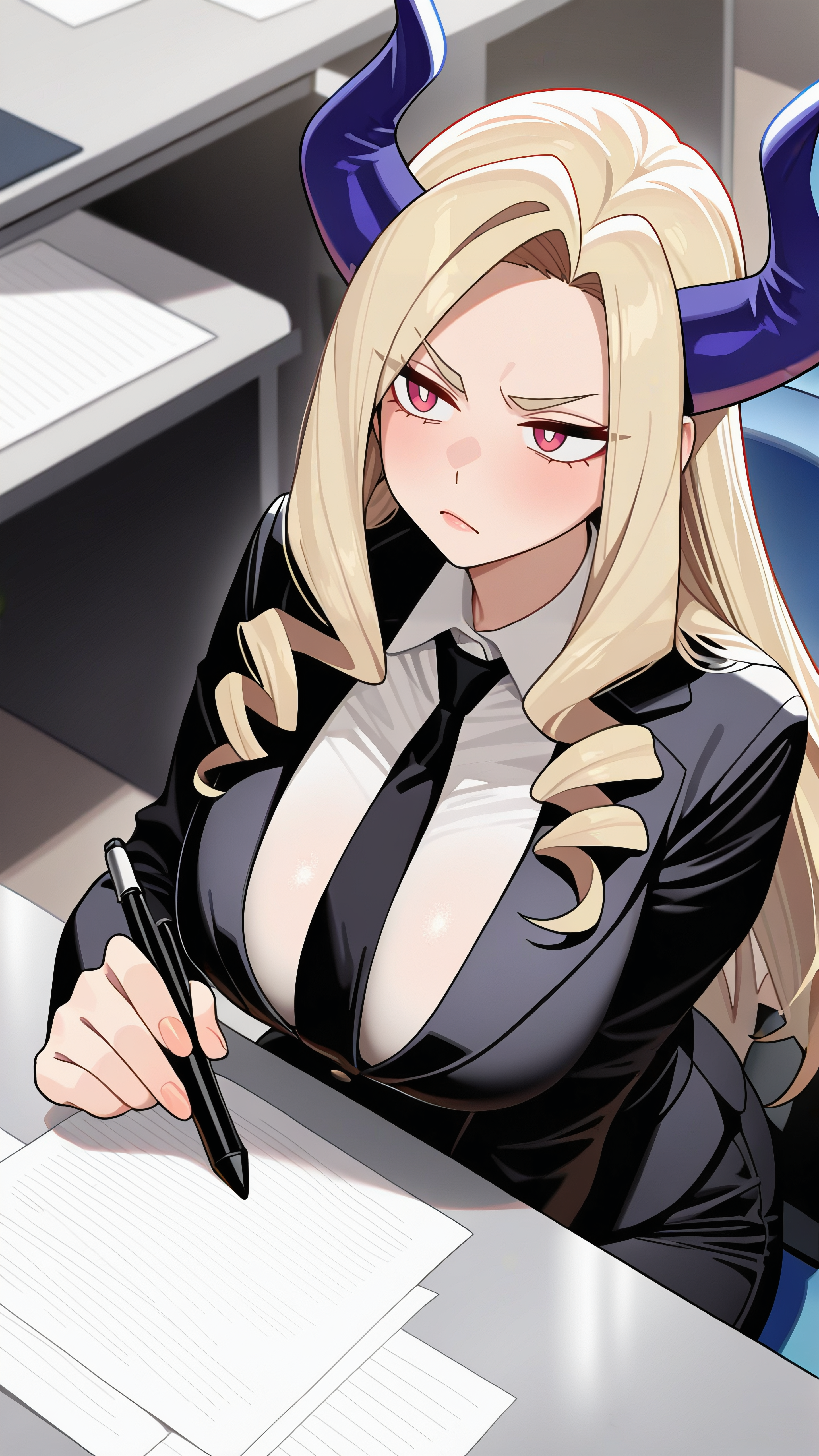 mt_lady, 红眼, 金发, 长发, 钻石发型, 明亮瞳孔, 面具眼罩, 双色紧身衣, 紫色紧身衣, 紧身,
